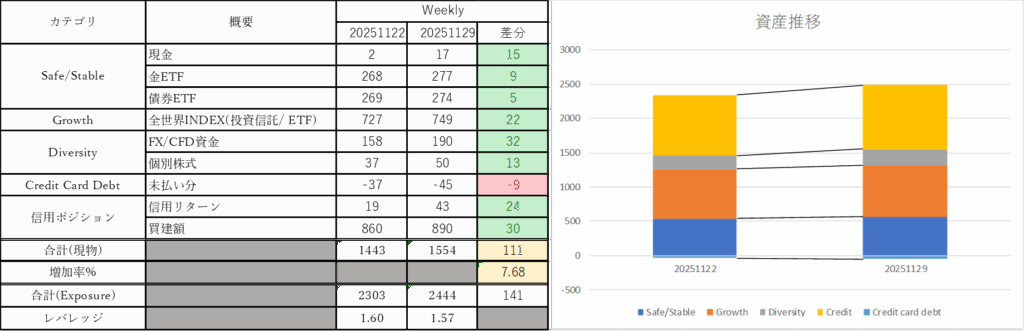 週次レポート KEKEK 2025年11月30日 0 コメント 【Weekly report】2025年11月4周目 全世界株式INDEXが復活 FX/CFDのほうも一気に回復 信用枠を少し拡大 + ポジションを少しずつ切り替え 所感 なんか一気に増えてる・・・怖・・・ にほんブログ村