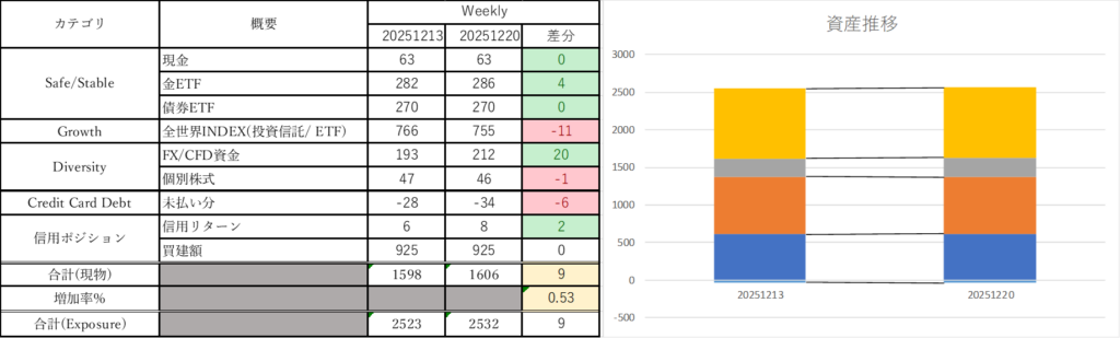金も株式も、週前半でガクッと落ちて、後半で取り返す動きだったような気がする。プラチナ、COCOA、Brent、USD/JPYが好調でFX/CFDがプラス。過去最低だった1か月前から数えると+54万円で、下落も大きいが上昇も大きくボラティリティ高め。もう少し比率を落としてもよさそうだが、リスクは取れるうちに取れということで放置。
